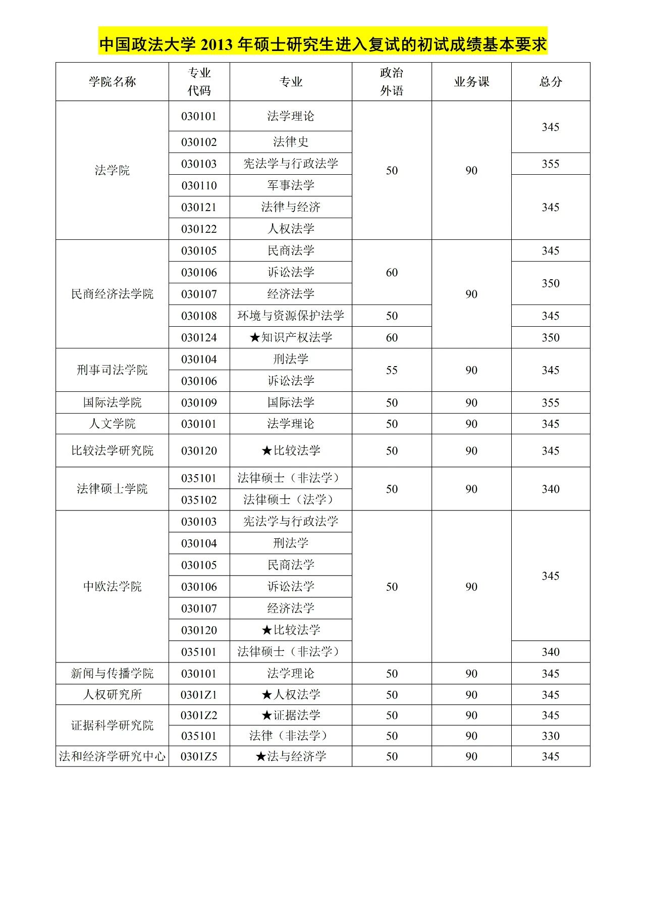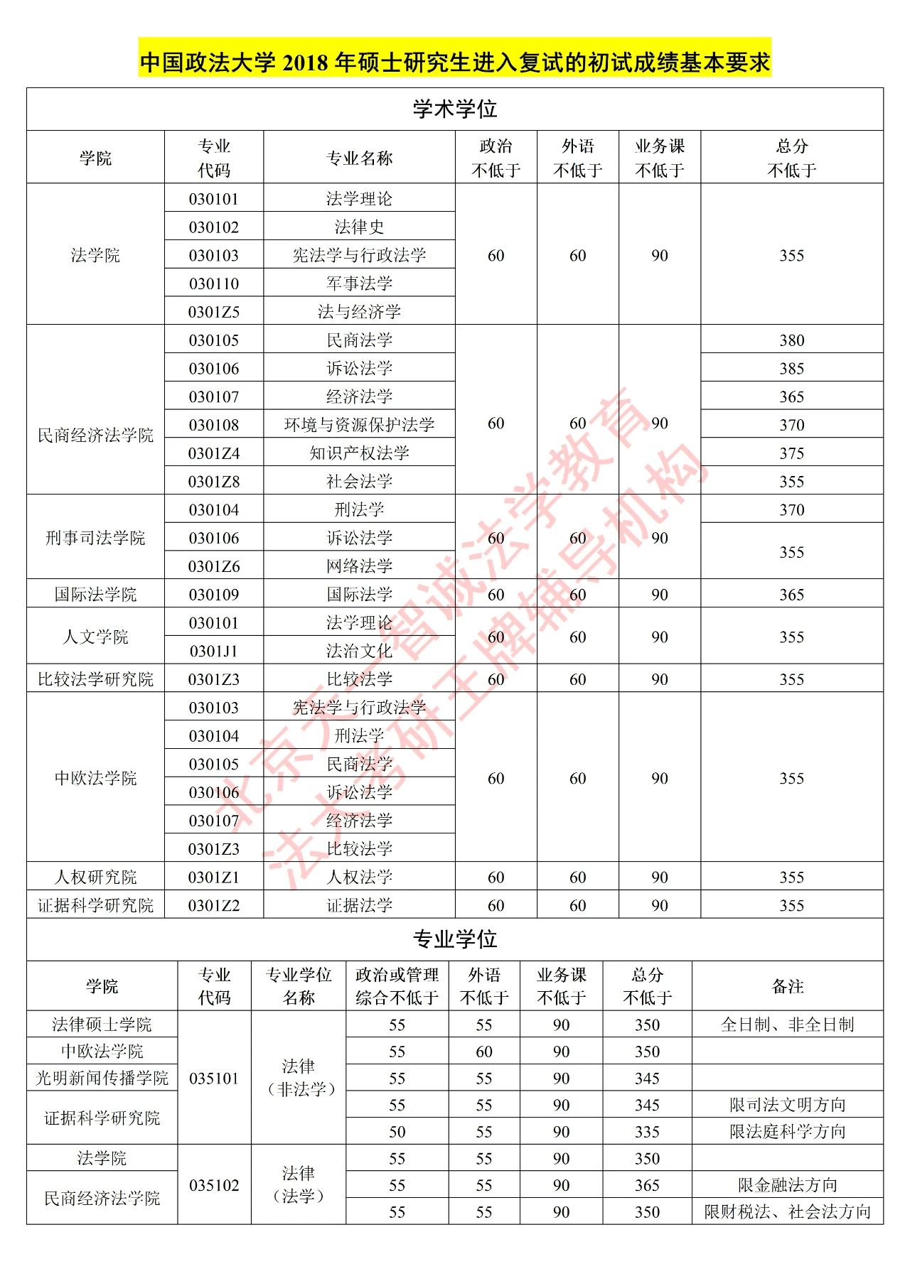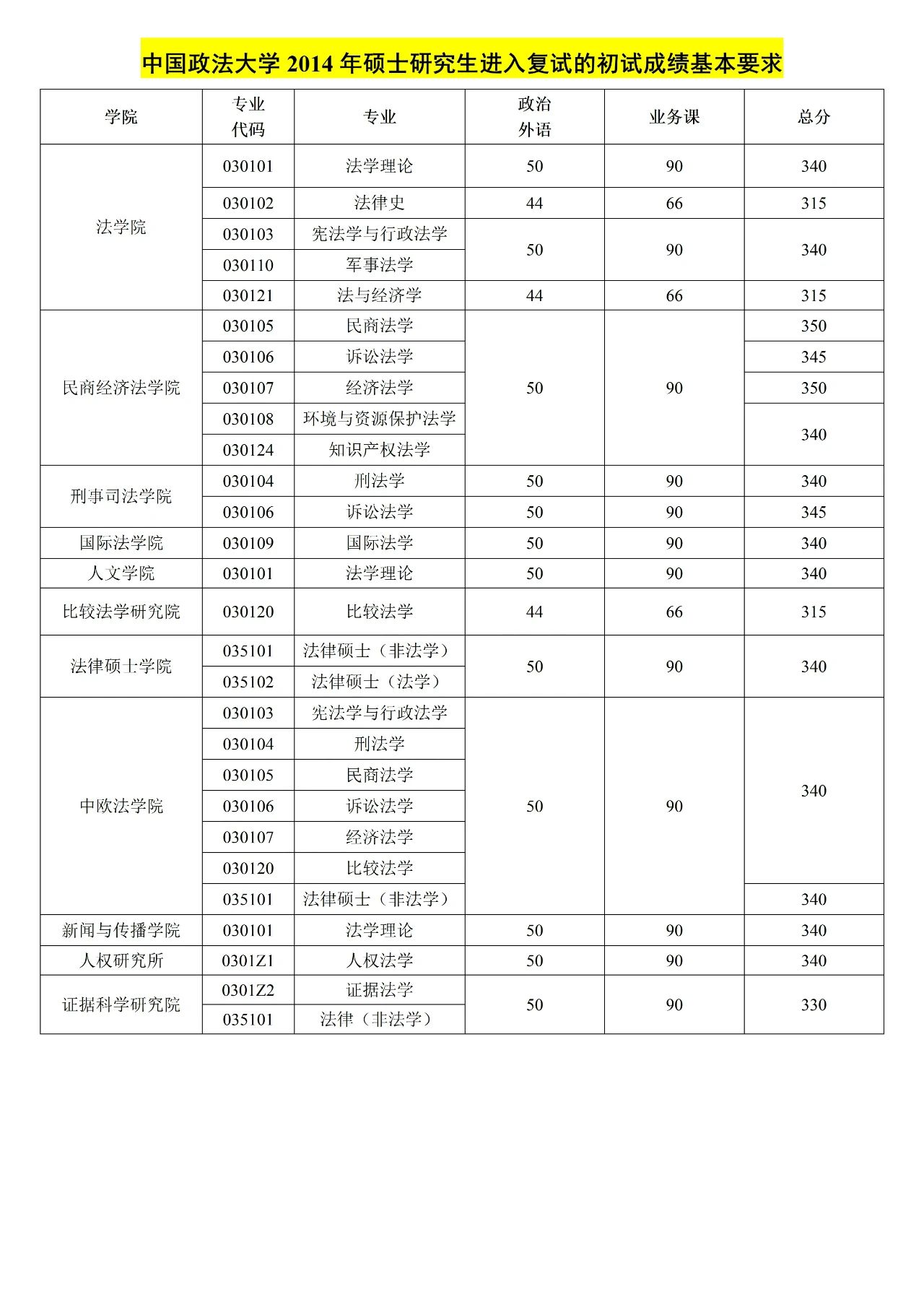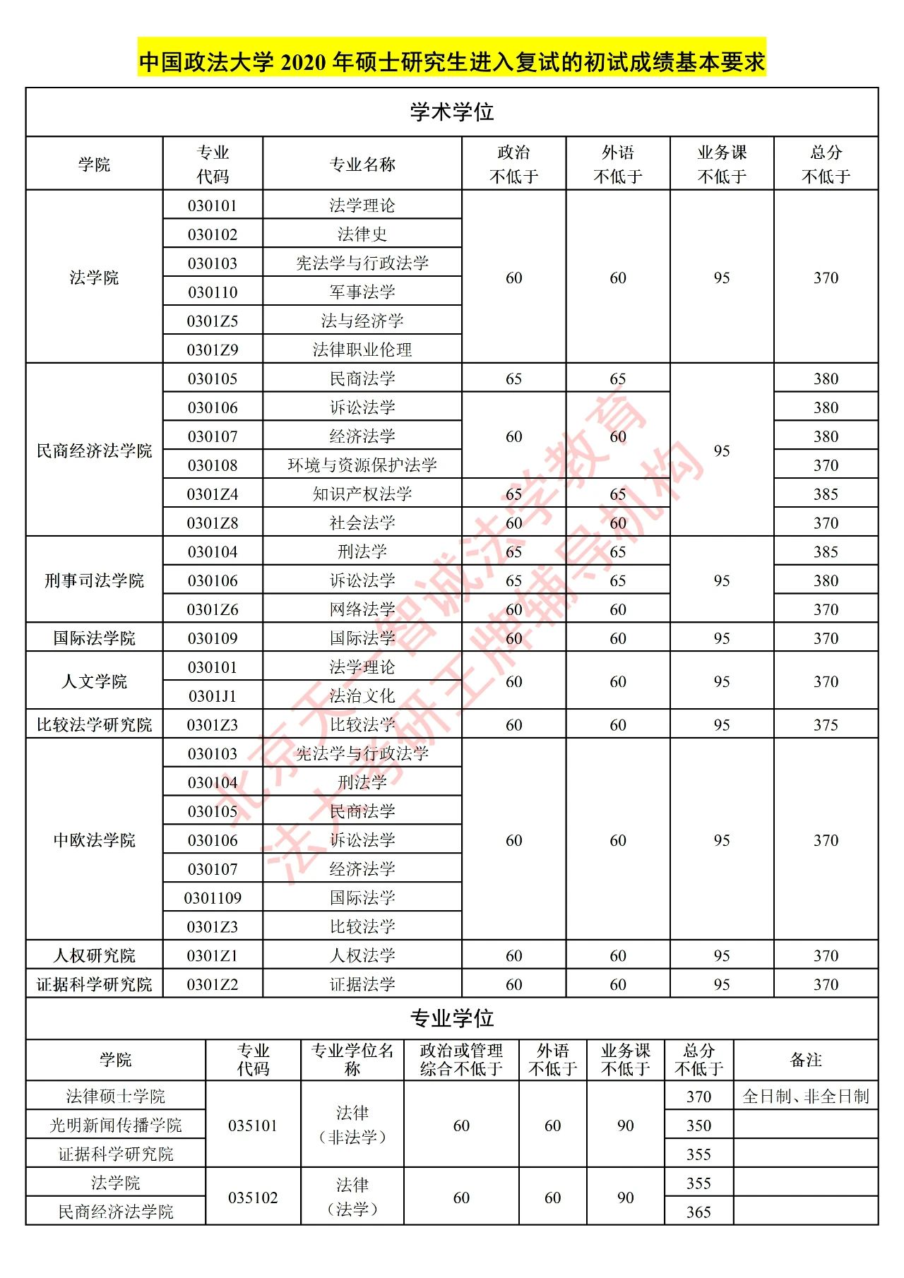 中国政法大学 法学硕士&法律硕士复试分数线