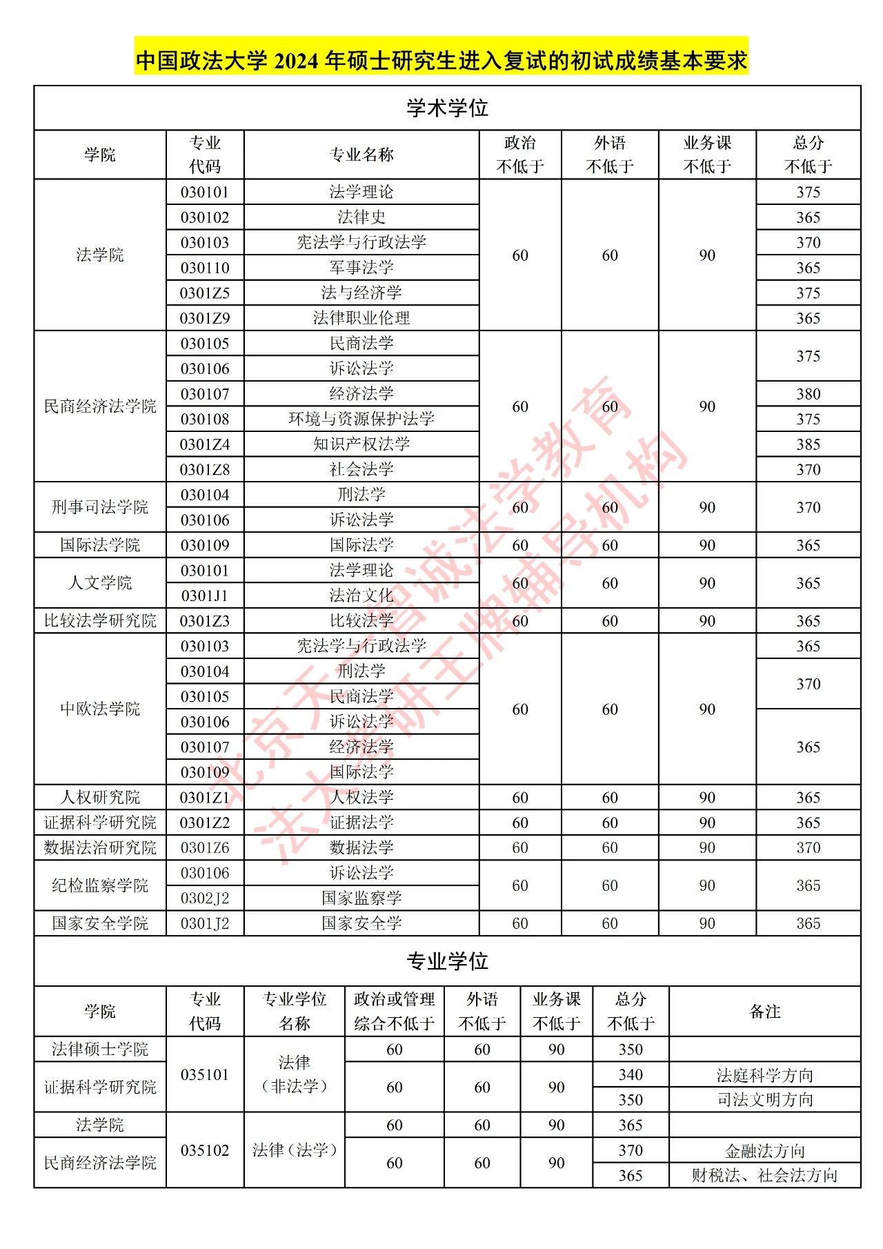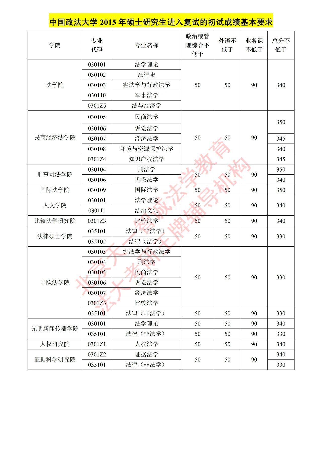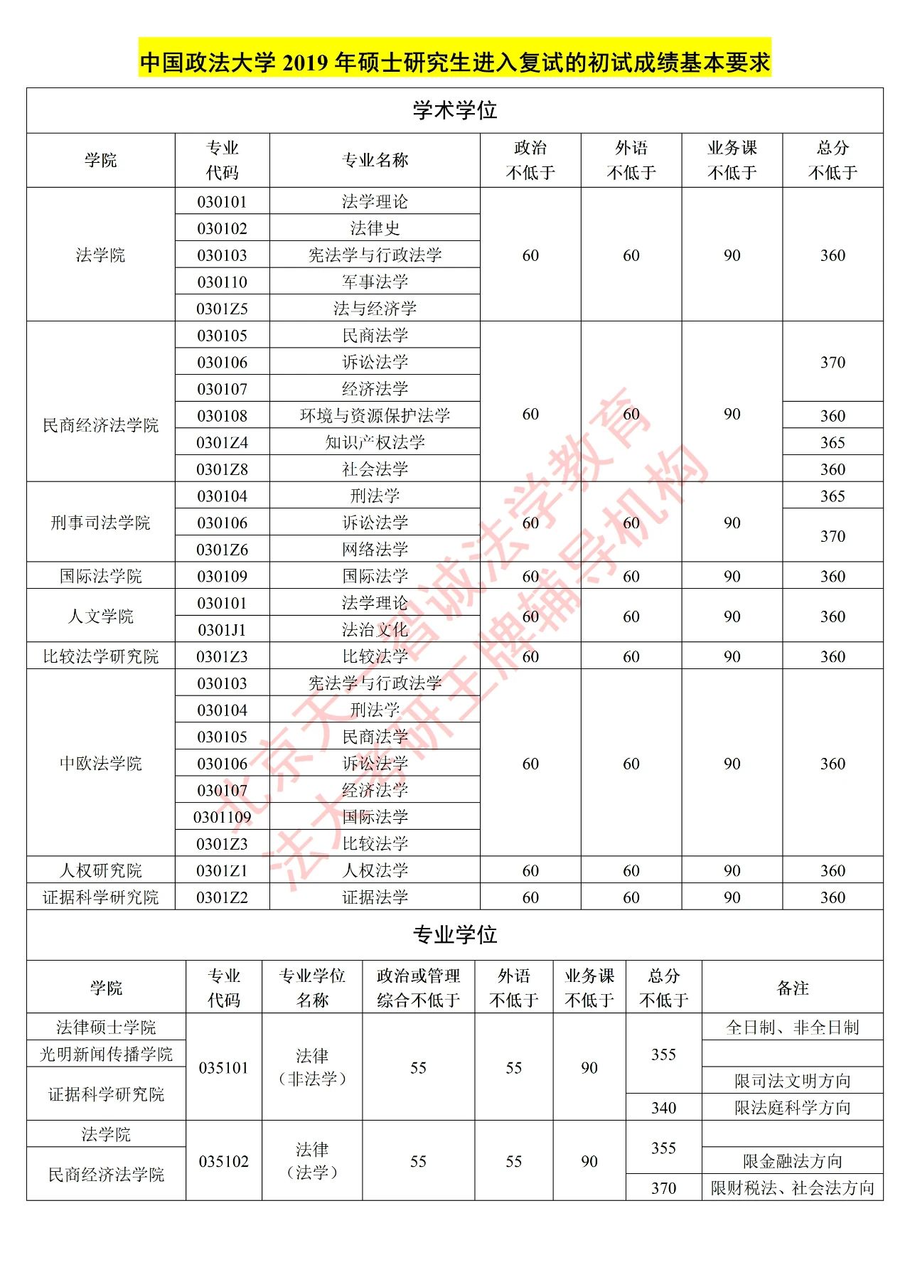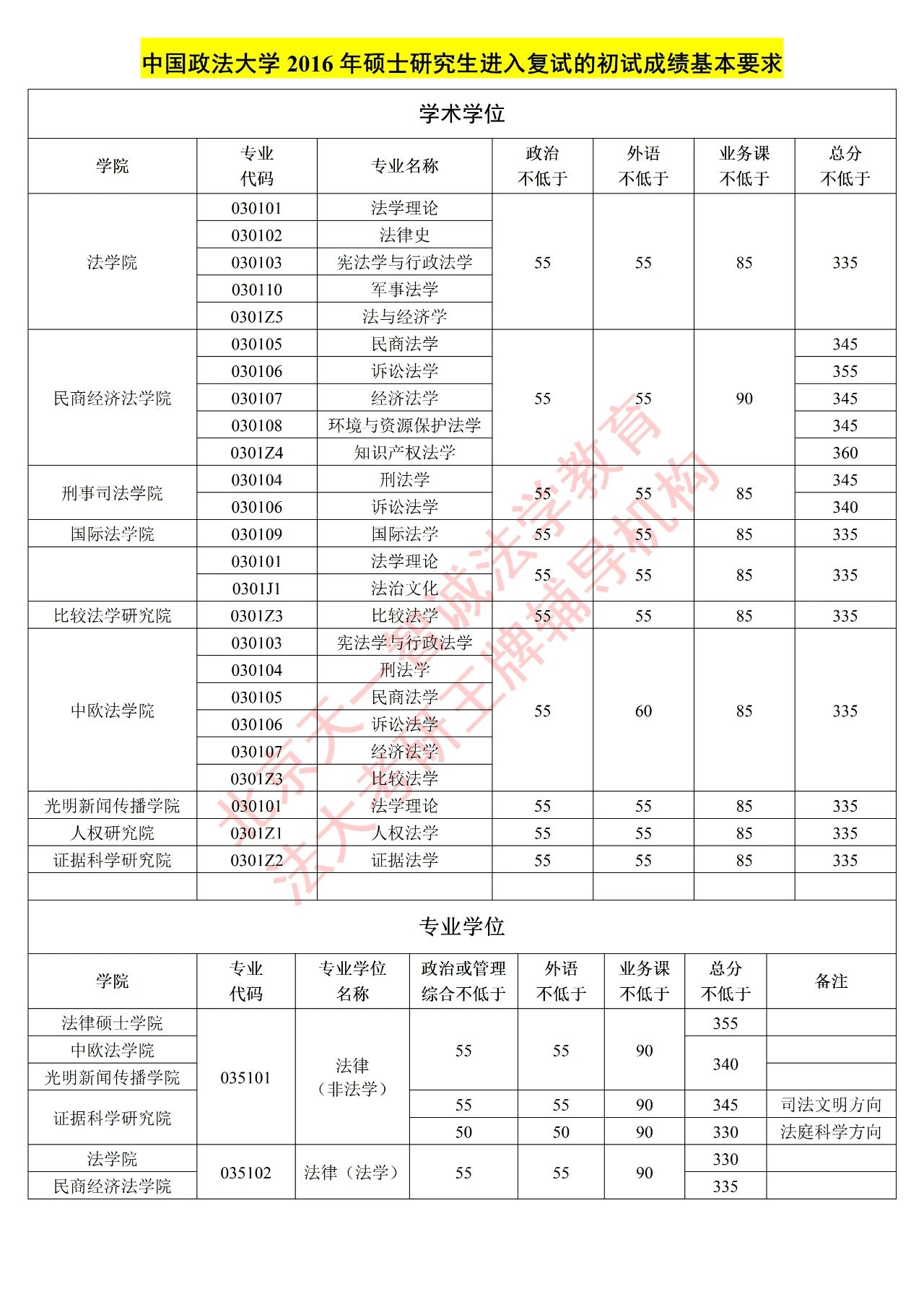 中国政法大学 法学硕士&法律硕士复试分数线